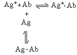 放射性免疫分析法这是80年代以来被日益广泛应用的超微量分析技术,具有灵敏度高和特异性强的突出优点。其基本原理是根据被测定的抗原物质和其标记物(标记抗原)同特异性抗体之间存在着竞争性的结合。若以 Ag和Ag*分别代表待测抗原和标记抗原,Ab代表抗体,Ag·Ab和 Ag*·Ab分别代表非标记的和标记的抗原抗体复合物,则当Ag与Ag*同时存在时,这一系统呈如下的平衡关系: