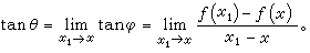 ),为此在曲线上取p的一邻近点Q(x1,y1)。很容易看到割线pQ的方向近似于质点在p处的瞬时方向,而且一般说来,x1愈接近x,近似程度就愈好。如果当Q沿曲线趋近p,割线pQ趋近某个极限位置pT,则占据这个极限位置的直线就称为曲线在点 p处的切线,这切线的方向就是运动质点在点 p处的瞬时方向。切线pT与横轴的夹角θ,就应当是割线pQ与横轴夹角φ的极限。因此切线pT的斜率k=tan θ可以如下计算: