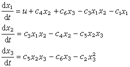 例如有一个生态系统,包括水、一个水生植物种群和一个草食动物种群,研究物质磷在系统中的变化过程。水、水生植物和草食动物含有磷的数量是系统的基本变量,分别以x1、x2和x3表示,称为状态变量;以u表示磷从流水中带进系统的速率,称为输入量;分别以y1和y2表示磷从水中流失和草食动物带出系统的速率,称为输出量。系统内部磷的变化关系见图2。