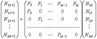其中m 代表该群体年龄可能达到的上界。于是种群变化的规律可以用下面的矩阵运算表示,