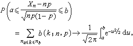 这说明,若p固定,当n充分大时,B(n,p)近似于正态分布。这个渐近公式最早由A.棣莫弗就p =1/2的情形加以证明,而后由P.-S.拉普拉斯加以推广,常称为棣莫弗-拉普拉斯中心极限定理。S.-D.泊松又证明了:若则