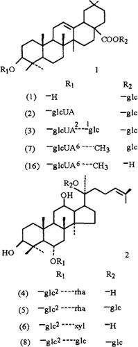 化学性质含挥发油、糖类[1]。从陕西、云南、四川等地产的珠子参根茎中分得多种齐墩果烷型和达玛烷型皂甙(见表),其中竹节参甙IVa甲酯[Chikusetsusaponin IVa methyl ester],即齐墩果酸-(3-O-β-D-葡萄吡喃糖醛酸甲酯)-28-O-β-D-葡萄吡喃糖甙、Sap-1[齐墩果酸-3-O-β-D-(6’-甲酯)-吡喃葡萄糖醛酸甙]和Sap-5{3-O[β-D-吡喃葡萄糖(1→2)-β-D-吡喃葡萄糖]-齐墩果酸-28-O-β-D-吡喃葡萄糖甙}为新化合物[2~7]。尚含齐墩果酸、β-谷甾醇和丁二酸[11]。