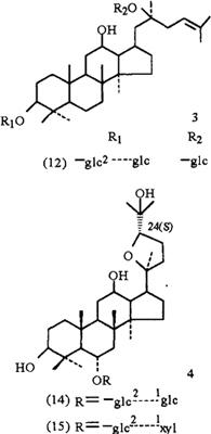 附 珠子参叶中含人参甙(Ginsenoside)Rd、Rb3、Rb1、Rc、Re、Rg1、Rg2和F2以及8个珠子参甙(Majoroside),即珠子参甙F1、F2、F3、F4、F5、F6和R1、R2,均为达玛烷型的三萜皂甙。珠子参甙F1为达玛-25(26)-烯-3β,12β,20(S),24β-四醇-(20-O-β-D-葡萄吡喃糖基)-3-O-β-D-葡萄吡喃糖基(1→2)-β-D-葡萄吡喃糖甙;珠子参甙F2为达玛-25(26)-烯-3β,12β,20(S),24α-四醇-(20-O-β-D-葡萄吡喃糖基)-3-O-β-D-葡萄吡喃糖甙;珠子参甙F3为达玛-23(24)-烯-3β,12β,20(S),22(α或β)-四醇-(20-O-β-D-葡萄吡喃糖基)-3-O-β-D-葡萄吡喃糖甙;珠子参甙F4为达玛-23(24)-烯-3β,12β,20(S),25-四醇-(20-O-β-D-葡萄吡喃糖基)-3-O-β-D-葡萄吡喃糖甙;珠子参甙F5为达玛-22(23)-烯-3β,6α,12β,20(S),24§-五羟基-(20-O-β-D-吡喃葡萄糖基)-6-O-α-L-吡喃鼠李糖基(1→2)-β-D-吡喃葡萄糖甙;珠子参F6为达玛-23(24)-烯-3β,6α,12β,20(S),25-五羟基-(20-O-β-D-吡喃葡萄糖基)-6-O-α-L-吡喃鼠李糖基(1→2)-β-D吡喃葡萄糖甙。珠子参甙(Majoroside)R1(14)和R2(15)的结构为[8~10,12]: