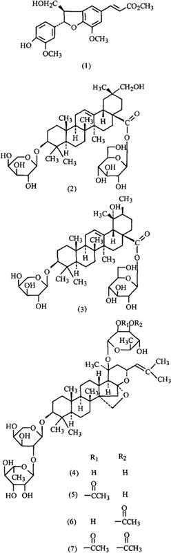 化学性质叶含槲皮素-3-O-葡萄糖甙、槲皮素-3-O-双葡萄糖甙、槲皮素3-O-芸香糖甙、鼠李亭(Rhamnetin)和圣草酚(Eriodictyol)[2]。十月份的叶所含黄酮比其他月份低,为2.76%(干重),其中含芸香甙为2.257%[3]。从叶得到新的木脂素(1)、齐墩果酸糖甙(2)和果树酸(Pomolic acid)的糖甙(3)[4],(1)在3μg/ml时能使大鼠主动脉的内源性PGI2(前列环素)提高25.3%[5]。从鲜叶又分到三个新的酸枣甙元(Jujubogenin)的糖甙(4)、(5)、(6),并对已知的枣素(Ziziphin)的原结构式[6]进行了修正(7)[7],(5)和(6)具有甜味抑制作用[7]。还含芸香甙、小檗碱、原阿片碱(Protopine)、蜡醇(Ceryl alcohol)、多量维生素C及苹果酸、酒石酸等[1]。