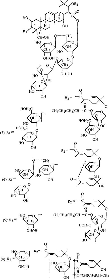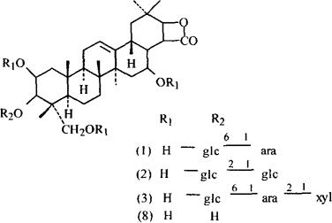 Gymnocladus saponin D的结构为2β,23-二羟基-3-O-α-L-吡喃鼠李糖基-21-O〔(6S)-2-反式-2,6-二甲基-6-α-L-吡喃阿拉伯糖氧基-2,7·辛二酸基〕金合欢酸28-O-β-D-吡喃木糖基-(1→3)-β-D-吡喃木糖基-(1→2)-〔L-吡喃鼠李糖基-(1→6)〕-β-D-吡喃葡萄糖基-(1→2)-β-D-吡喃葡萄糖甙的(6S)-2-反式-2,6-二甲基-6-羟基-2,7-辛二酸盐[3]。