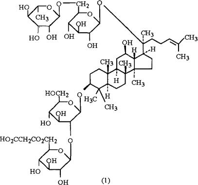 化学性质地上部分含85种达玛烷型皂甙:绞股蓝皂甙(Gy-penoside)1~79、TN-1、TN-2、原绞股蓝皂甙元A2[1]、6″-丙二酰人参皂甙-Rb1、6″-丙二酰人参皂甙-Rd和6″-丙二酰绞股蓝皂甙5(1)。其中绞股蓝皂甙3、4、8、12分别与人参皂甙-Rb1、-Rb3、Rd、F2结构相同。绞股蓝皂甙1~16等经酶水解得20(S)原人参萜二醇的20-O-β-D-葡萄吡喃糖甙(即人参皂甙K);绞股蓝色甙3、4、5等经弱酸水解得人参皂甙Rg3[1]。