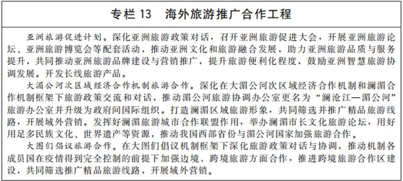 实施“十四五”时期文化保护传承利用工程,加大旅游基础设施建设支持力度,完善覆盖城乡、全民共享、实用便捷、富有特色的旅游基础设施网络。把旅游公共服务设施建设纳入新型基础设施建设计划。鼓励推行区域旅游景点套票、月票、年卡和旅游公交等服务。优化重点旅游区域机场布局,规划建设一批对沿线旅游发展具有重要促进作用的干线铁路、城际铁路和资源开发性支线铁路,强化交通网“快进慢游”功能,加强交通干线与重要旅游景区衔接,加强乡村旅游公路和旅游景区客运索道建设。完善公路沿线、服务区、客运枢纽、邮轮游艇码头等旅游服务设施功能,推进通用航空与旅游融合发展。健全重点旅游景区交通集散体系,鼓励发展定制化旅游运输服务。