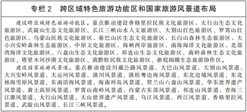 (一)构建旅游空间新格局。综合考虑文脉、地脉、水脉、交通干线和国家重大发展战略,统筹生态安全和旅游业发展,以长城、大运河、长征、黄河国家文化公园和丝绸之路旅游带、长江国际黄金旅游带、沿海黄金旅游带、京哈—京港澳高铁沿线、太行山—武陵山、万里茶道等为依托,构建“点状辐射、带状串联、网状协同”的全国旅游空间新格局。健全京津冀协同发展、长江经济带发展、粤港澳大湾区建设、长三角一体化发展、黄河流域生态保护和高质量发展等区域重大战略旅游协调机制,推进跨行政区域旅游资源整合利用。加强区域旅游品牌和服务整合,支持京张体育文化旅游带、黄河文化旅游带、巴蜀文化旅游走廊、杭黄自然生态和文化旅游廊道、太行山区等旅游发展。持续推进跨区域特色旅游功能区建设。继续推出一批国家旅游风景道和自驾游精品线路,打造一批世界级、国家级旅游线路。鼓励各地区因地制宜实现差异化发展。