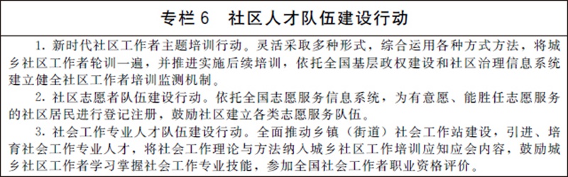 (十六)加强社区服务教育培训。加强社区服务人才培训管理,建立健全社区工作者能力指标体系,健全完善分级培训制度,用好现有培训基地和在线培训平台。依托各级各类干部网络培训平台开放共享社区服务精品课程,推动优质网络培训资源直达村(社区)。鼓励有条件的院校开展社区服务相关人才培养和社区工作者能力提升培训,强化社区服务人才供给。加强对社区工作者的民族、宗教政策法规培训,不断促进民族团结,铸牢中华民族共同体意识。加快培育发展社区社会工作专业人才、社区志愿者,加强社会组织人才建设。结合农民工自身特点开展职业技能培训,引导农民工从事社区服务业。