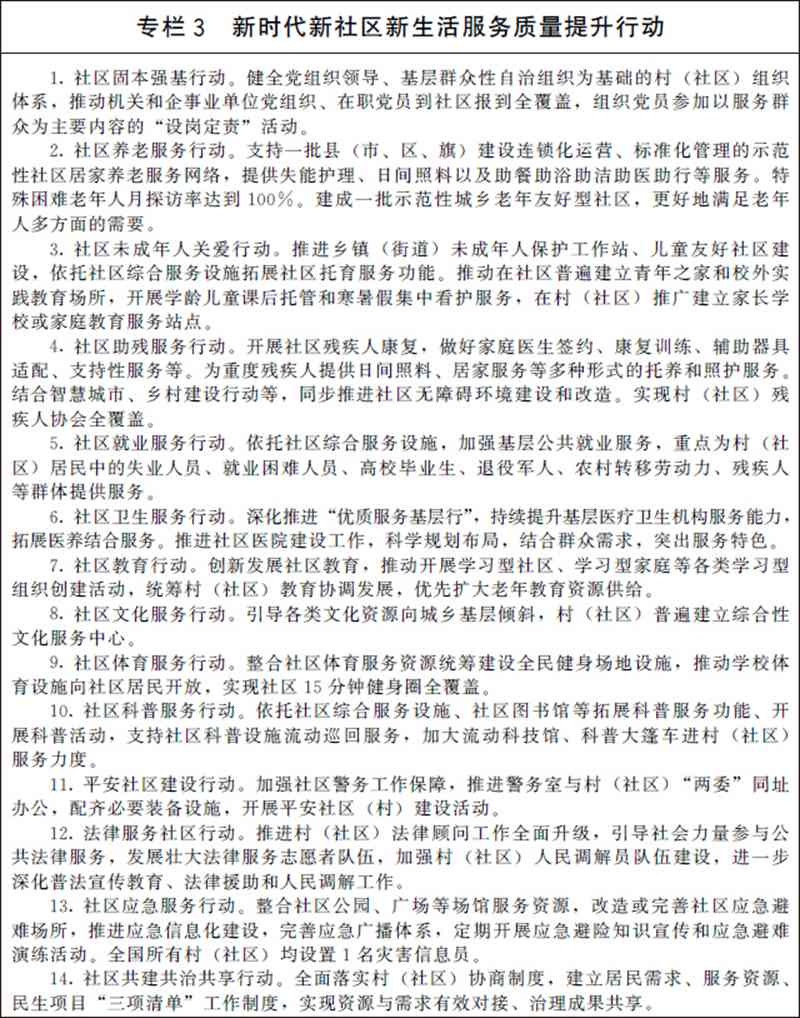 (九)强化便民服务功能。全面推进城市一刻钟便民生活圈建设,加快推进农村生活服务便利化。引导市场、社会力量发展社区托育、养老等服务业态。推动物流配送、快递、再生资源回收网点设施辐射符合条件的村(社区),鼓励发展社区物业、维修、家政、餐饮、零售、美容美发等生活性服务业,支持相关企业在村(社区)设置服务网点,满足居民多样化需求。鼓励有条件的地方引进专业化物业服务,建立健全业主和物业服务企业双向选择机制。完善城市居民委员会组织体系,指导和监督业主委员会、物业服务企业依法履行职责。依托村级综合服务设施、供销合作社等强化农村地区农产品收购、农资供应等服务供给。