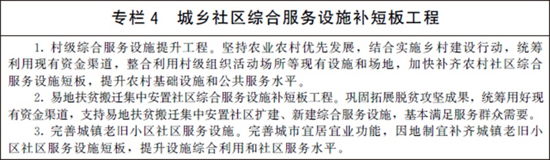 (十一)优化服务设施布局。将综合服务设施建设纳入国土空间规划,推进新建社区综合服务设施标准化规范化建设,确保新建社区商业和综合服务设施面积达标。实施城乡社区综合服务设施补短板工程,鼓励通过换购、划拨、租借等方式,统筹利用社区各类存量房屋资源增设服务设施。有条件的地方可通过租赁住宅楼底层商业用房等其他符合条件的房屋开展社区服务。鼓励有条件的地方开展城市社区综合服务体建设,促进便民利民服务集聚集群发展、项目化系统化供给。建设智能快件箱(信包箱)和邮政快递末端综合服务站等配套设施。实施村级综合服务设施提升工程,完善村级综合服务设施网络,推进标准化建设。统筹利用益农信息社等村级服务站点,增强村级综合服务功能。加快建设易地扶贫搬迁集中安置社区综合服务设施,确保2025年实现综合服务设施全覆盖。按照老年人、未成年人、残疾人优先的原则,优化社区综合服务设施空间布局,促进各类服务设施功能差异互补、内容衔接配套。推动社区卫生服务中心与社区养老服务机构毗邻建设,推进社区设施适老化、适儿化改造和无障碍建设。精简整合办公空间推行开放式办公,增加居民活动区域面积。农村要合理规划群众举办红白喜事等活动的公共场所,统筹考虑布局公益性安葬服务设施。