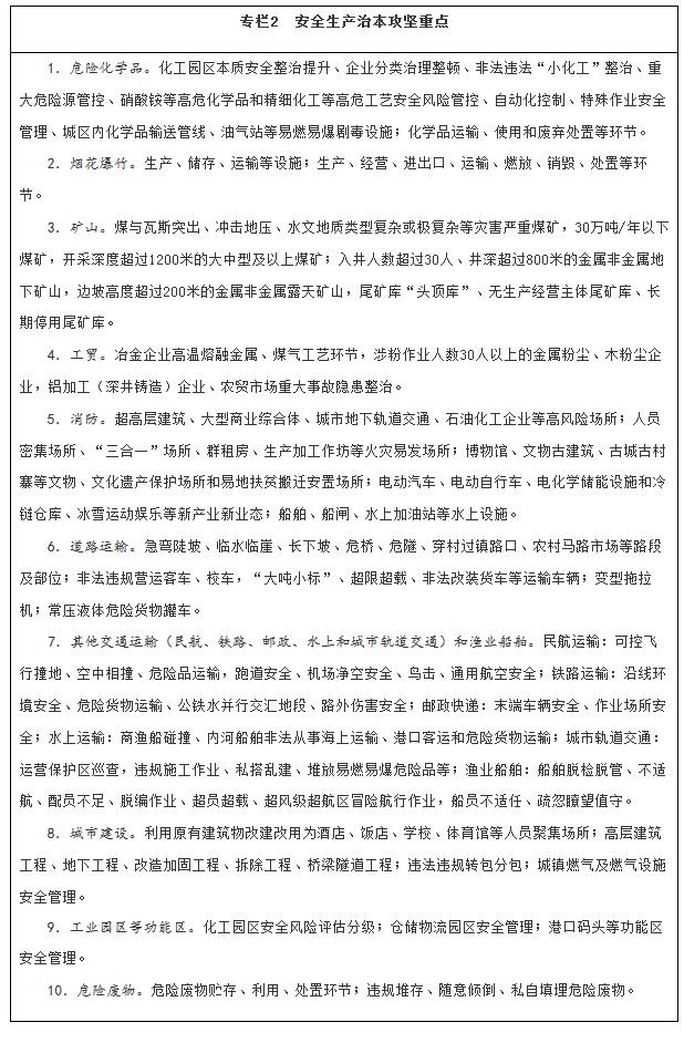 实施化工园区安全提质和危险化学品企业安全改造工程,以危险工艺本质安全提升与自动化改造、安全防护距离达标改造、危险源监测预警系统建设为重点,推进化工园区示范创建,建设化工园区风险评估与分级管控平台。推进城镇人口密集区危险化学品生产企业搬迁改造。开展煤矿瓦斯综合治理和水害、火灾、冲击地压等重大灾害治理。基本完成尾矿库“头顶库”安全治理及无生产经营主体尾矿库、长期停用尾矿库闭库治理。实施“工业互联网+安全生产”融合应用工程,建设行业分中心和数据支撑平台,建立安全生产数据目录。