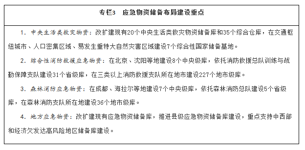 充分利用仓储资源,依托现有中央和地方物资储备库,建设综合应急物资储备库。在交通枢纽城市、人口密集区域、易发生重特大自然灾害区域建设一批综合性国家储备基地。建设完善国家综合性消防救援队伍应急物资储备库及战勤保障站。在关键物流枢纽建设应急物资调运平台和区域配送中心,依托大型快递物流企业建设一批综合应急物资物流基地。完善国家应急资源管理平台和应急物资保障数据库,汇聚应急物资信息。