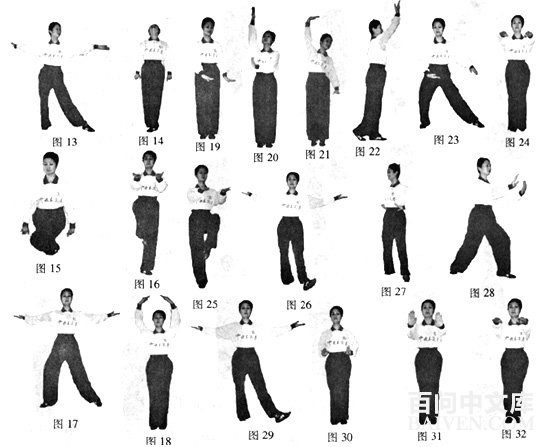 动作:1、双手从两腰侧反穿手至(掌心朝外)平肩高,出左脚(图13);