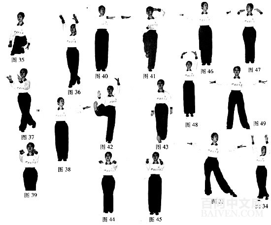 3、抡指下蹲(在腿两侧抡指),掌朝下(图35);