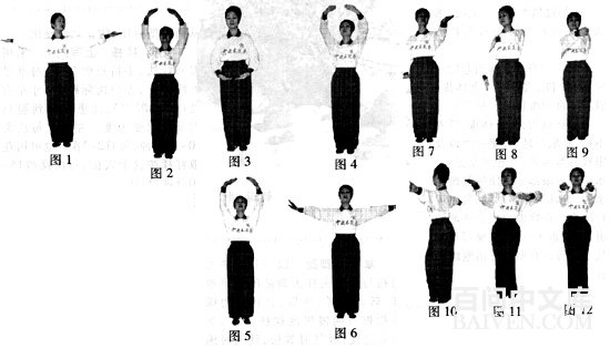动作:1、双手侧平举,眼看左手方,双手手心朝上(图1);