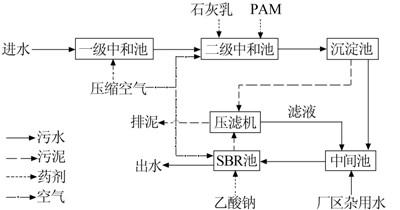 ¶Ô·ÏË®½øÐÐÎﻯԤ´¦ÀíµÄÄ¿µÄÊÇÈ¥³ý²¿·ÖÎÛȾÎTFe¡¢Zn2+£©£¬²¢Íê³ÉpHµÄµ÷Õû¡£²ÉÓÃÁ½¼¶ÖкͳÁµí¹¤ÒÕ£ºÒ»¼¶ÖкͳزÉÓü۸ñµÍÁ®µÄʯ»Òʯ½øÐÐËáµÄÔ¤Öкͣ¬¼õÉÙÖкÍÒ©¼ÁÓÃÁ¿£»¶þ¼¶ÖкͳØÍ¨¹ýͶ¼Óʯ»ÒÈéµ÷½ÚpH£¬²¢Í¨¹ýÆØÆø½«Fe2+Ñõ»¯³ÉFe3+¡£×îÖÕÐγɳÁµíÈ¥³ýFe2+¡¢Zn2+£»ÒòÄàÁ¿½Ï´ó£¬Îª¸ÄÉÆÄàË®·ÖÀëЧ¹û£¬ÔÚ¶þ¼¶ÖкͳØÖмÓÈë¾Û±ûÏ©õ£°·£¨PAM£©£¬È»ºó½øÈë³Áµí³Ø³Áµí¡£ÎÛË®¾ÎﻯԤ´¦Àíºó£¬½øÈëºóÐøÉúÎïÍѵª´¦Àí¹ý³Ì¡£