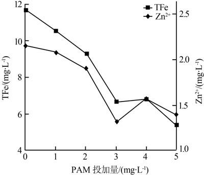 ³Áµí1 hºó£¬È¡ÉÏÇåÒº²â¶¨²»Í¬PAMͶ¼ÓÁ¿Ï£¬TFe¡¢Zn2+µÄÈ¥³ýЧ¹û£¬½á¹ûÈçͼ 3Ëùʾ¡£