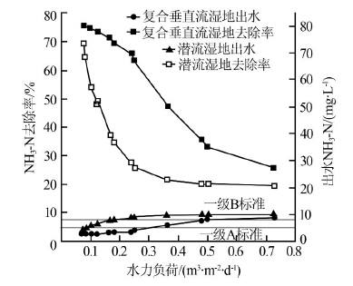 由图 1可见,两种人工湿地床的出水COD与水力负荷有密切关系,出水COD均随水力负荷的提高而增大。水力负荷为0.167 m3/(m2·d)时湿地床出水COD均优于《地表水环境质量标准》(GB 3838— 2002)(以下简称水体)Ⅲ(20 mg/L)类水体标准,说明在此工况下人工湿地对COD达到十分显著的去除效果。水力负荷<0.5 m3/(m2·d)时,湿地床对碳源均有较好的去除效果,COD去除率均在70%以上,出水均优于《城镇污水处理厂污染物排放标准》(GB 18918—2002)(以下简称标准)一级A(50 mg/L)标准。继续增加水力负荷达到0.725 m3/(m2·d),潜流人工湿地床对COD仍可达到很好的去除效果,COD去除率为80.25%,出水COD为33 mg/L,出水水质优于一级A(50 mg/L)标准,甚至达到Ⅴ类水体(40 mg/L)标准;而对于复合垂直流人工湿地,在水力负荷为0.725 m3/(m2·d)时,COD去除率为65.1%,出水COD为58 mg/L,出水水质仅能满足一级B(60 mg/L)标准。整体而言,相对于复合垂直流人工湿地,潜流人工湿地对碳源的去除效果更佳。这与肖宇芳等的研究结果一致。此外,还可以看出:对于碳源的去除,潜流人工湿地床受水力负荷的影响更为显著。