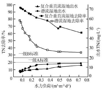 由图 3可见,两种人工湿地的出水TN指标随水力负荷增加而变差。水力负荷为0.725 m3/(m2·d)时,潜流人工湿地TN去除率为33.29%,出水TN 14.01 mg/L,复合垂直流湿地去除率为45.65%,出水TN 12.01 mg/L,两种人工湿地的出水均达到一级A(15 mg/L)排放标准;水力负荷<0.2 m3/(m2·d)时,复合垂直流TN去除率保持在60%以上,而对于潜流人工湿地,水力负荷<0.125 m3/(m2·d)时,TN去除率保持在60% 以上。