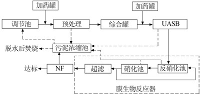 ÉøÂËÒº½øÈëµ÷½Ú³ØÇ°ÏȾ¹ý¹ýÂ˺ͳÁµíÈ¥³ýÏËά˿ºÍÄàɳµÈÎÞ»úÎ²¢ÔÚµ÷½Ú³Ø³ö¿Ú´¦¼ÓÈȵ½ÑáÑõÒªÇóζȣ¬È»ºóÔÚ×ۺϹÞÖе÷½ÚpHºÍÓªÑøÔªËØ¡¢Î¶ȵȣ¬ÔÙÓñÃÌáÉý½øÈëUASBµ×²¿¡£ÑáÑõ´¦ÀíºóµÄ³öË®£¬½øÈëMBRϵͳ½øÒ»²½´¦Àí¡£ÎªÁËÈ·±£ÏµÍ³µÄÎȶ¨ÐÔ£¬±¾¹¤³ÌÖн«Éú»¯ÏµÍ³ºÍ³¬ÂËϵͳ·Ö±ð¶ÀÁ¢ÉèÖá£ÑáÑõ³öË®Ê×ÏȽøÈëA/OÉú»¯ÏµÍ³½øÐÐÏõ»¯-·´Ïõ»¯Íѵª¡£Éú»¯³Ø³öË®½øÈ볬Â˹¤ÒÕÖнøÐйÌÒº·ÖÀ룬²úË®½øÈëNF½øÒ»²½½ØÁô²»¿ÉÉú»¯µÄ´ó·Ö×ÓÓлúÎï¼°²¿·ÖÑη֡¢ÄÉÂ˵ÄÇåÒº¡£·ÖÀëµÄÎÛÄàͨ¹ýÑ»·±Ã»ØÁ÷ÖÁÉúÎï·´Ó¦Æ÷ÄÚ£¬ÆäÖеÄÎÛÄàÖÊÁ¿Å¨¶È¿É´ïµ½10¡«15 g/L£¬´¦ÀíЧÂÊ´ó·ù¶ÈÌá¸ß¡£ÄÉÂ˹ý³Ì²úÉúµÄŨËõÒº¾¹ýÐõÄýºó½øÎÛÄàŨËõ³Ø½øÐд¦Àí¡£