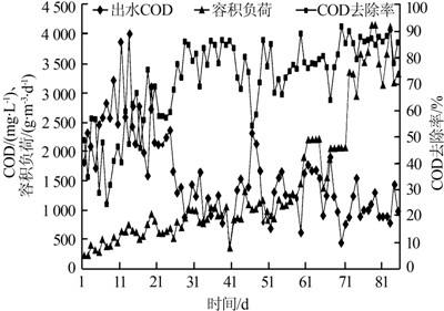 ÓÉͼ 2¿É¼û£¬ÔÚ1¡«25 d£¬ÎÛÄà´¦ÓÚѱ»¯ÆÚ£¬½øË®Á¿Îª50 m3/d£¬¸ººÉ¿ØÖÆÔÚ1 kg/£¨m3¡¤d£© ÒÔÏ£¬´Ë½×¶Î³öË®COD²¨¶¯ºÜ´ó£¬È¥³ýЧÂʲ»Îȶ¨¡£25 dÒÔºóÈ¥³ýÂÊÇ÷ÓÚÆ½ÎÈ£¬½øË®¸ººÉÓÉ1 kg/£¨m3¡¤d£© ¿ªÊ¼£¬Ã¿´Î0.5 kg/£¨m3¡¤d£© ¸ººÉÌáÉý£¬ÌáÉýÖÜÆÚ²»¹Ì¶¨£¬¾¹ý50¶àÌìµÄÔËÐУ¬ÈÝ»ý¸ººÉ¿ÉÒÔÎȶ¨ÔÚ4 kg/£¨m3¡¤d£©ÒÔÉÏ£¬È¥³ýÂÊÎȶ¨ÔÚ90%×óÓÒ¡£