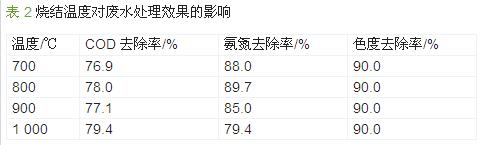 在TiO2质量分数为6%,黏合剂质量分数为2.0%,铁炭比为1∶1的条件下,考察了不同烧结温度下制备的微电解材料对印染废水的处理效果,结果如表 2所示。