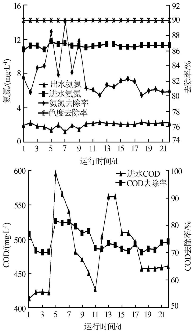 由于烧杯试验为间歇性且废水处理量较小,无法模拟工业中的连续处理过程,为此,本研究以自制的微电解处理系统,在22 d的连续运行状态下对印染废水进行处理。微电解处理系统的连续运行效果如图 5所示。