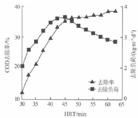 由图2 可知,A 段整体的去除负荷都较高,当其HRT 为30~60 min 时,COD 去除负荷均达到2.0kg/(m3·d)以上。但是HRT 较短时,COD 去除率较低。当HRT≤40 min 时,COD 去除率低于30%;HRT≥45 min 时,COD 去除率超过35.5%。但是继续延长HRT,COD 去除率增加缓慢,而去除负荷下降却较快,装置整体效能不高,所以AB 法的A 段HRT 确定为45~50 min 较为合适。