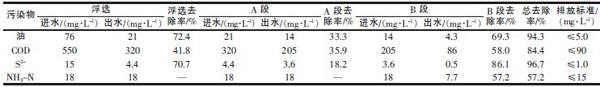由表3 可以看出,含油污水经浮选与生物吸附法(AB 法)联合处理后,污水中石油类、COD、S2-、NH3 -N 的平均去除率分别达到94.3% 、84.4% 、96.7%、57.2%,综合处理效果较好。浮选单元对含油污水的石油类的去除效果非常理想,平均去除率达到72.4%;AB 法对有机物(COD)的去除效果也较为理想,尤其是A 段的COD 平均去除负荷达到3.68 kg/(m3·d),B 段的COD 平均去除负荷也有0.36kg/(m3·d)。而且,处理后总出水水质较好,显示出AB 法对含油污水有较好的处理深度。这是由于AB法的吸附段(A 段)对大分子有较强的吸附去除,为生物降解段(B 段)降解其他有机物创造了条件。对于该工艺的处理成本,由于该工艺采用的是涡凹气浮除油方法,其电耗仅为加压溶气气浮的1/6~1/8;连同药剂费,吨水处理成本仅需1.1 元左右。而生物吸附法的A 段由于负荷高、处理时间极短,总的生化处理段成本也不高;只考虑各电机的耗电费用的话,吨水处理成本约为1.2 元。所以采用涡凹气浮与生物吸附联合处理该类含油污水,不仅技术可行,而且运行成本也较低。