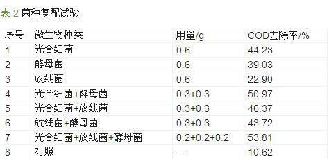¾úÖÖ¸´ÅäÊÔÑé½á¹û¼û±í 2¡£Óɱí 2 ¿É¼û£¬²»Í¬¾úÖÖ¸´ÅäÖ®ºó¶Ô·ÏË®µÄ´¦ÀíЧ¹ûÒªºÃÓÚµ¥¾úÖÖ£¬ÆäÖÐ3 ÖÖ¾ú¸´ÅäµÄ´¦ÀíЧ¹û×îºÃ£¬¿ÉÒÔ´ïµ½53.81%£¬ËµÃ÷Õâ3 ÖÖ¾úÖ®¼äÓÐÐͬ×÷Ó᣷ÅÏß¾ú¶Ô¸Ã¿¹ÉúËØ·ÏË®¾ßÓÐÒ»¶¨µÄÈ¥³ýЧ¹û£¬ËùÒÔÉÏÊöµ¥ÒòËØÊÔÑéÖзÅÏß¾úÓÃÁ¿µÄÊÔÑé½á¹û¿ÉÄÜÊÇÓɵڶþÖÖÔÒòÒýÆðµÄ¡£Òò´Ë£¬Ê¹Óø´ºÏ¾úÖÖ´¦Àí¸Ã¿¹ÉúËØ·ÏË®ÊÇ¿ÉÐеġ£