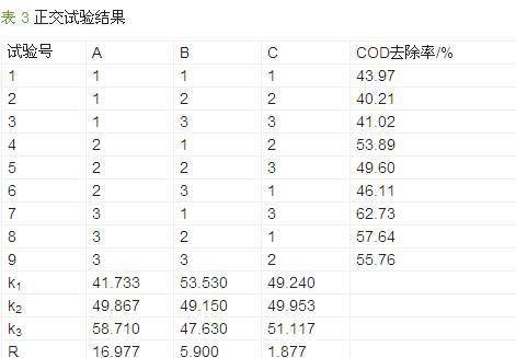 ¸´ºÏ¾úÖÖÅä±ÈÕý½»ÊÔÑé½á¹û¼û±í 3¡£Óɱí 3 ¿ÉÖª£¬Í¨¹ý±È½ÏR µÃµ½Ó°Ïì´ÎÐòΪ£ºA>B>C¡£ËùÒÔ£¬Ôڸÿ¹ÉúËØ·ÏË®´¦ÀíµÄ¹ý³ÌÖУ¬¹âºÏϸ¾úËùÆðµÄ×÷ÓÃ×î´ó£¬Æä´ÎÊǽÍĸ¾ú£¬·ÅÏß¾úËùÆðµÄ×÷ÓÃÂÔС¡£Í¨¹ýÕý½»ÊÔÑéÈ·¶¨¸´ºÏ¾úÖÖ×î¼ÑÅä±È·½°¸A3B1C1£¬È·¶¨¹âºÏϸ¾ú¡¢½Íĸ¾úºÍ·ÅÏß¾úµÄÓÃÁ¿·Ö±ðΪ10¡¢6¡¢2 g/L¡£