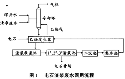 乙炔发生器产生的渣浆废水进入渣浆收集池,再用泥浆泵输送到渣浆沉淀池,在池中进行沉淀处理。上部清液经溢流进人竖流式二级沉淀池中,进行充分沉淀,使废水中Ca(OH)2微粒再次沉降,清液溢流入集水池,用清水泵送入乙炔发生器,与冷却塔废水混合后在乙炔发生器内与电石进行反应,使高PH、高S2-、CODcr废水得以闭路循环使用。