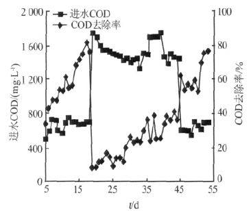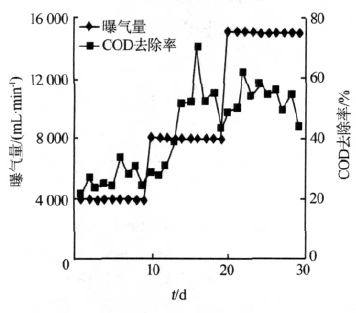 µÚÒ»½×¶Î£¬µ±½øË®COD ¿ØÖÆÔÚ500¡«733 mg/LÖ®¼äʱ£¬¿ªÊ¼µÃµ½µÄCOD È¥³ýÂÊΪ35%£¬Ëæ×Å·´Ó¦Æ÷µÄ²»¶ÏÔËÐУ¬³öË®COD Öð½¥¼õС£¬ÏàÓ¦µÄÈ¥³ýÂʲ»¶ÏÌá¸ß£¬×îºóµÄ3 d ʱ¼äÀȥ³ýÂÊÎȶ¨ÔÚ75%×óÓÒ¡£´ÓµÚ19 Ì쿪ʼ£¬½«½øË®COD Ìá¸ßµ½1 340¡«1 740mg/L£¬ÕâʱCOD È¥³ýÂÊ¿ìËÙϽµ£¬Ò»Ö±½µµ½9%¡£µ½35¡«44 d£¬È¥³ýÂÊÓÐËùÌá¸ß£¬×îÖÕÎȶ¨ÔÚ37%×óÓÒ¡£´ÓµÚ45 Ì쿪ʼ£¬ÔٴνµµÍ½øË®COD£¬Ò»Ö±½µµ½650mg/L£¬ÕâʱµÄÈ¥³ýÂÊ¿ªÊ¼ÉÏÉý£¬´ïµ½62%£¬·´Ó¦Æ÷Îȶ¨ÔËÐÐ5 d ºó£¬È¥³ýÂʼÌÐøÉÏÉý£¬²¢´ïµ½76%¡£Õâ¿ÉÄÜÊÇÓÉÓÚ·´Ó¦Æ÷ÄÚ´æÔÚ×Å´óÁ¿½øÐй²´úл×÷ÓõÄÑáÑõºÍºÃÑõ¾úȺ£¬µ±ÆØÆøÁ¿Ò»¶¨Ê±£¬Î¢ÉúÎï¿ÉÒÔ×î´ó³Ì¶ÈµØÀûÓÃÈܽâÑõ£¨DO£©À´½µ½â·ÏË®ÖеÄCOD£¬µ±·ÏË®ÓлúÎïŨ¶ÈÉý¸ßʱ£¬DO ÕâʱÒѾ³ÉÎªÖÆÔ¼ÒòËØ£¬Ê¹µÃºÃÑõ¾ú²»Äܵõ½×ã¹»µÄÑõÀ´¼°Ê±½µ½â·ÏË®ÖеÄÓк¦ÎïÖÊ£¬²»ÄÜΪ²ú¼×Íé¾úµÈÑáÑõ¾úÌṩһ¸öÓÐÀûµÄ´úл»·¾³¡²8¡³£¬ËùÒÔµ¼Öµڶþ½×¶ÎCOD È¥³ýÂʵĿìËÙ´ó·ùϽµ¡£
