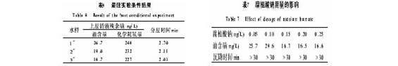 ¡¡¡¡ºÏ·ÖÎö,È·¶¨ÊʺÏÓÚº¬ÓÍ·ÏË®·ÖÀëµÄ×î¼ÑÌõ¼þΪ:¾ÛºÏÁòËáÌúΪ0.4mg L,pHʼΪ3.0,pHÖÕΪ7.0,¾Û±ûÏ©õ£°·Îª80mg L,¸¯Ö²ËáÄÆÎª0.20mg L,ÔÚ¸ÃÌõ¼þÏÂ,¾»»¯ºóË®ÖÐÓͺ¬Á¿Îª4.5mg L,»¯Ñ§ºÄÑõÁ¿Îª61.5mg L,³Á½µÊ±¼äΪ2min¡£×îºóÒÔ1#¡¢2#¡¢3#Ë®Ñù×öʵÑé,½á¹ûÈç±í8¡£