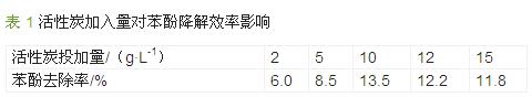 在微波功率为13.2 W、辐照时间5 min 的条件下,考察活性炭投加量对苯酚降解率的影响,见表 1。从表 1 可见,理想的活性炭投加量为10 g/L。