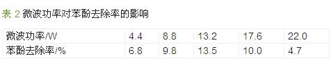 由表 2 可以看出,当微波功率较低时,苯酚去除率随功率的增加而增大,微波功率为13.2 W 时苯酚去除率达到最高;当功率超过13.2 W 时,苯酚去除率反而下降。
