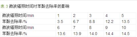 在微波功率为13.2 W 时,测定微波辐照时间对苯酚降解效果的影响,见表 3。由表 3 可见,苯酚去除率随微波辐照时间的延长而增加,超过5 min 后去除率增加缓慢。因此选择辐照时间为5 min。