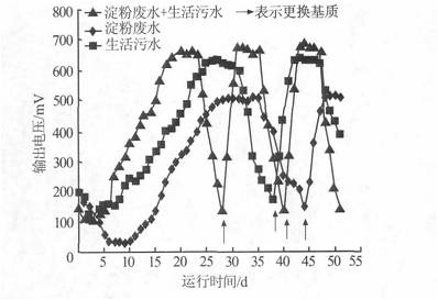 由图1可知,当利用混合菌源接种时,反应器运行19d,输出电压基本稳定在660mV,即完成启动;而接种淀粉废水和生活污水的MFC,反应器分别运行27d和26d时,输出电压基本稳定在510mV和630mV,即完成启动。试验结果表明,前者较后两者启动时间分别缩短了29.6%和26.9%,而且稳定时的输出电压也较高。