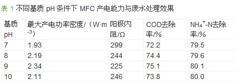 试验去掉阳极缓冲体系,并以1mol/L的NaOH调节阳极基质pH。为防止碱的加入引起基质离子强度的改变,通过NaCl调节溶液离子强度,以确保离子强度相等。不同基质pH条件下MFC的产电能力与废水处理效果如表1所示。