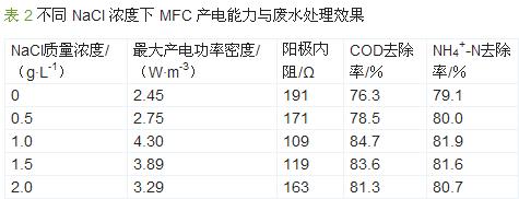 本研究变换阳极基质NaCl的浓度,对MFC基质离子强度进行优化。不同NaCl浓度下MFC的产电能力与废水处理效果如表2所示。