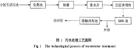 生活污水经化粪池溢流通过格栅,经集水井通过提升泵进入沉淀调剂池,经沉淀调节后的出水,由泵提升进入SBR池,出水排放(或部分经过接触消毒后回用) , 污泥由污泥泵从沉淀池和SBR池一起打入污泥池,浓缩、脱水后外运处理。此工艺设计具有占地面积小、投资少、管理简单等优势被业主选用,其进、出水主要指标见表1。