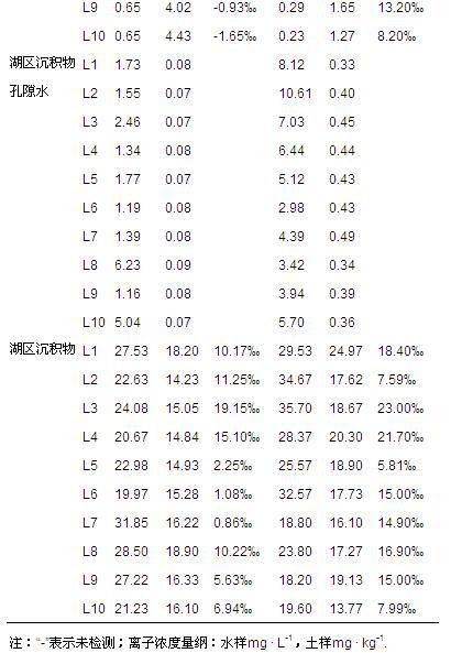 以聚乙烯瓶采集500 mL上覆水,用于水化学分析.以聚乙烯桶采集10 L水样,加硫酸调节至pH=2,冷藏保存,用于水样同位素分析.沉积物离心出孔隙水并以0.22 μm滤膜过滤,用于水化学分析.沉积物样品自然风干,以粉碎机粉碎并过100目筛,以KCl溶液浸提,用于化学分析与同位素分析.
