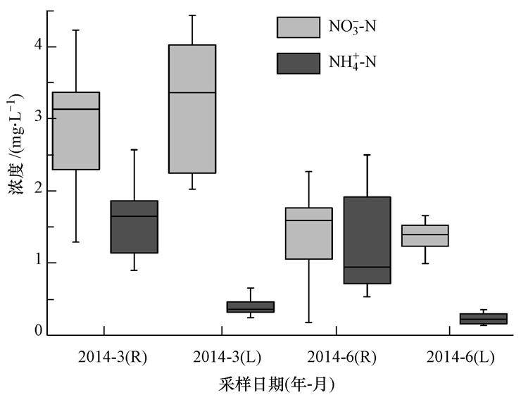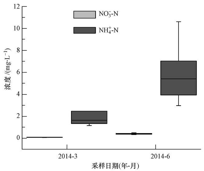 太湖西部湖区NO3--N浓度为0.99~4.43 mg · L-1,3月NO3--N浓度高于6月;NH4+-N浓度为0.13~0.65 mg · L-1,3月NH4+-N浓度高于6月.西部湖区无机氮以NO3--N为主,3月、6月NO3--N浓度分布范围基本与入湖河流一致,NH4+-N浓度均低于入湖河流.
