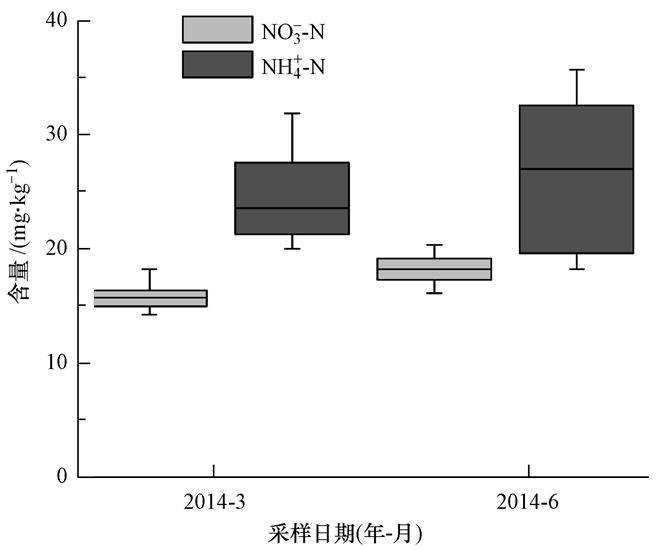 西部湖区沉积物吸附态无机氮各赋存形态含量分布如图 4所示.由图 4、表 1分析可知,湖区沉积物吸附态NO3--N含量为13.77~24.97 mg · kg-1,NH4+-N含量为18.20~35.70 mg · kg-1.3月、6月沉积物吸附态无机氮均表现为NH4+-N含量高于NO3--N.NO3--N与NH4+-N含量均表现为6月高于3月.