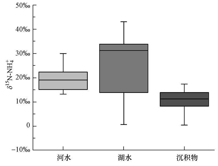 有研究表明,一定条件下,NH4+的挥发作用与硝化作用会使得残余物质中富集15N,即δ15N-NH4+值升高.由图 5与图 6水体与沉积物的δ15N统计特征分析可知,西部湖区上覆水δ15N-NH4+高于入湖河流水体,湖区水体NH4+-N浓度低于入湖河流,NO3--N浓度略高于入湖河流,由此可以判别湖区发生了较显著的硝化作用.同时,湖区水体δ15N-NO3-高于入湖河流水体(图 5),可能由于上覆水中15N富集的NH4+经硝化作用产生了较高的δ15N值的NO3-.