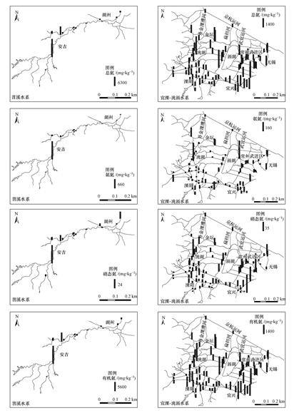 各形态N含量在西苕溪和宜溧-洮滆水系空间上具有较大的变化(表 2),如TN的最小值仅为142.60 mg · kg-1,最大值可达12597.68 mg · kg-1,相差超过88倍;NH4+-N的最大值超过最小值600倍.由图 2可知,TN和NH4+-N的最大值均出现在西苕溪水系的高桥附近.沉积物NO3--N最大值和最小值分别位于宜溧-洮滆水系的新塘桥附近和西苕溪水系的红山村附近.ON空间分布特征与TN相似,其最小值位于西苕溪水系的东彭家村附近,最大值位于该水系的高桥附近.从两个水系的上下游分析,发现在城市分布较为密集的区域,TN含量明显增大;但在无城镇聚集区域,两条水系沉积物中TN含量变化规律不明显.