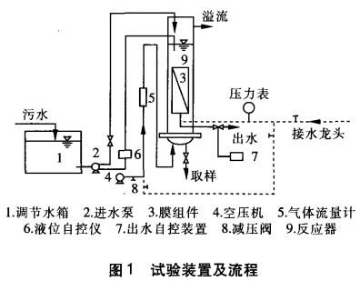 采用两套完全相同的装置(分别记作ln}2#)进行试验。工艺流程见图1反应器为有机玻璃制成,直径为200mm,高为2m,内置孔径为0.2um、膜面积为0.5m2的聚偏氟乙烯中空纤维膜组件。依重力间歇出水,由液位自控仪控制反应器内水位基本恒定。