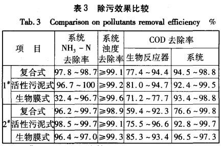 从表3可知,三种一体式膜生物反应器对氨氮、浊度和COD的去除率都很高,但生物反应器去除COD的效果相差较大,相比较而言活性污泥一膜生物反应器的去除效果更稳定些。