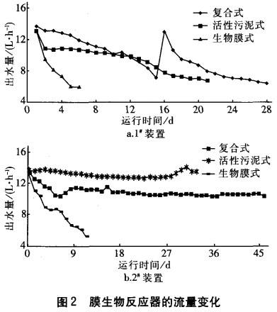 三种一体式膜生物反应器出水量的变化情况如图2所示。在两种运行工况下均是生物膜一膜生物反应器的膜通量下降速度最快,复合式膜生物反应器次之,活性污泥一膜生物反应器的膜通量下降速度最慢;对于同一种类型的膜生物反应器而言,第二种运行工况下的膜通量下降速度较慢。